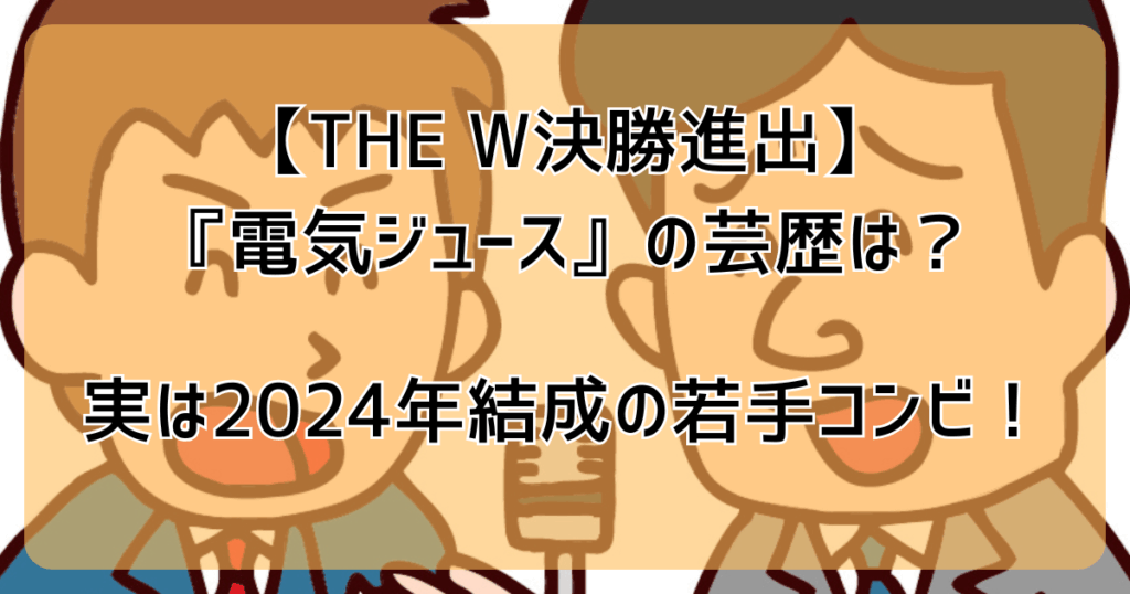 THE W 2025の決勝に進出した「電気ジュース」。テレビで初めて見て、「このコンビ誰?」「芸歴どれくらい?」「最近結成したの?」と気になって検索している人も多いはずです。 電気ジュースは、まだ結成して間もない女性コンビですが、テンポの良い掛け合... -