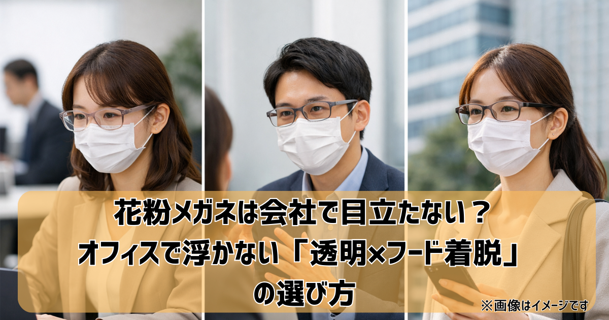 この記事では、花粉症の治療とか難しい話はしません。あくまで生活用品としての花粉メガネを、オフィス/通勤/おしゃれ/透明/フード着脱の視点で「どう選ぶと自然に見えるか」をサクッと整理します。