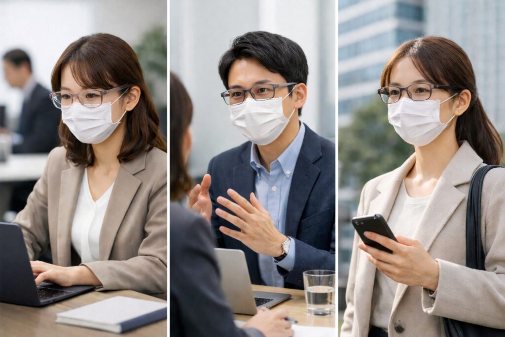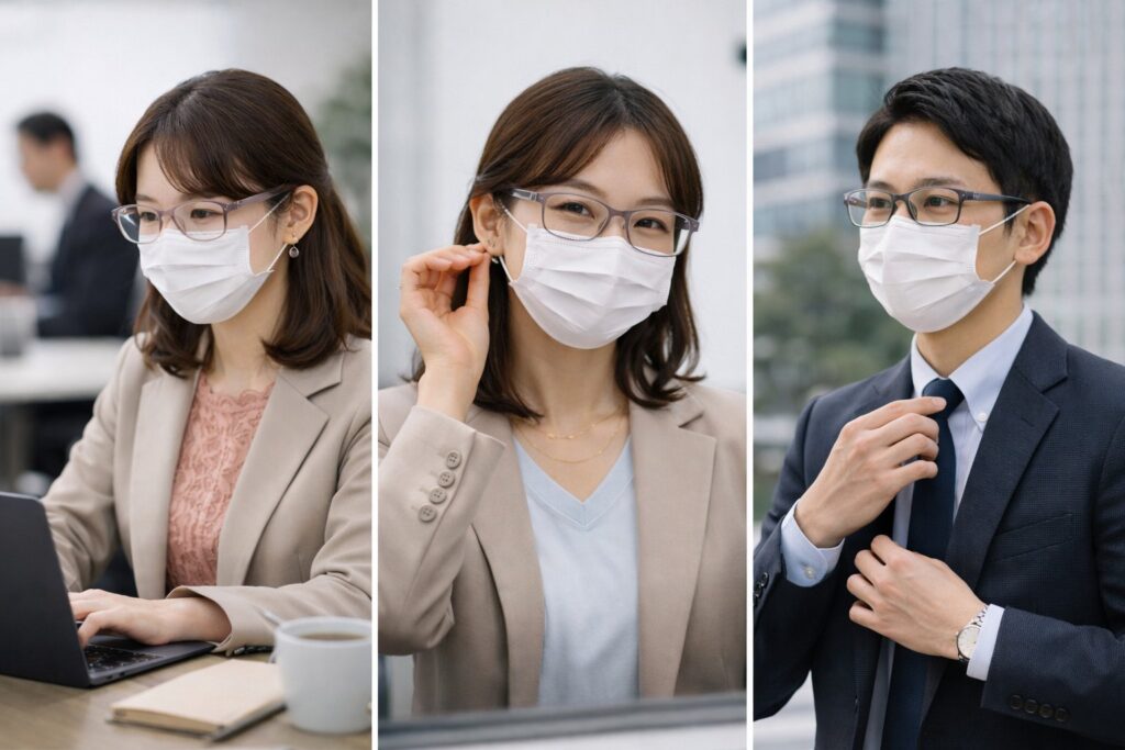 次の見出しでは、通勤〜オフィスの流れで「マスク併用でも“おしゃれ”が崩れないコツ」をまとめます。ここを押さえると、「結局いつものマスクだけ」から抜け出しやすくなります。